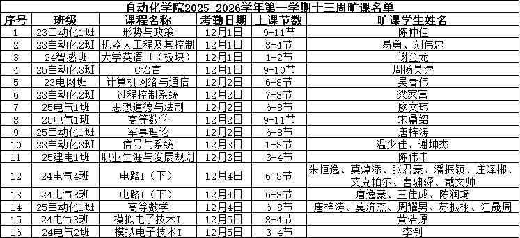 現(xiàn)將自動化學(xué)院2025-2026學(xué)年第一學(xué)期13周課堂缺勤情況公示如下: